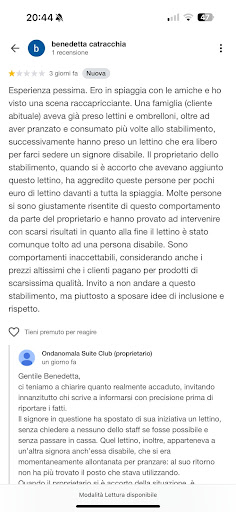 Read moreLo stabilimento è bello, ben tenuto, pulito con tutte le attrezzature del caso. Suggerirei a mio avviso di distanziare maggiormente le postazioni ma a parte questo lo stabilimento è piu che positivo. Nella stessa giornata abbiamo deciso di mangiare nel loro ristorante, è vero i prezzi sono piu alti del normale ma nessuno obbliga nessuno a mangiarci, la qualità però anch'essa è piu alta e i piatti erano abbastanza abbondanti e buoni. Vi chiederete il perchè allora di solo 3 stelle, la mia valutazione risiede anche nella risposta del cameriere. Faccio presente che non abbiamo prenotato e quindi alle 12.50 ci siamo avvicinati al ristorante per chiedere se fosse possibile mangiare, il cameriere (un ragazzetto biondino) ci domanda se avessimo prenotato e alla nostra risposta negativa reagisce dicendoci : bravi (con tono di scherno e di superiorità). Ci siamo sentiti umiliati, i tavoli erano vuoti eravamo solo in 3/4 e successivamente sono stati riempiti solo altri 2 tavoli. Il fatto che noi non avessimo prenotato non autorizza il ragazzetto a fare il simpatico e a farci sentire dei "coglioni". Avrà voluto scherzare? Voleva fare il simpatico? Beh non ci è riuscito, fosse stato per me me ne sarei andato via immediatamente ma il resto del gruppo ha soprasseduto e quindi abbiamo pranzato. Come ho detto prima lo stabilimento è piu che positivo e si mangia anche bene, spero in futuro quando ritornerò che il cameriere si comporti in modo piu...
