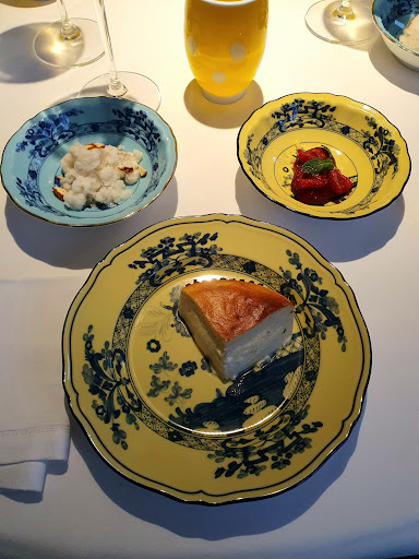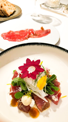 -Passando al cibo, la qualità della materia prima è -ovviamente- eccellente. Abbiamo preso tutti e quattro il menù degustazione (160 euro), vero e proprio percorso incentrato sulla massima valorizzazione dei prodotti, ottimi equilibri di sapori, sapidità e da rispetto per i prodotti. Subito un gradito benvenuto: una stella marina ripiena di salsa tonnata e capperi ed una tartina con wasabi, cavolo romano e acciuga. Per gli antipasti, abbiamo avuto una "divisione" perché due su quattro non mangiano ostriche, per cui: io e mio padre abbiamo avuto l'antipasto a base di ostrica bretone, accompagnata da una salsa all'acetosella, tabasco verde e una granita al cioccolato bianco; gli altri, invece, hanno avuto "Mare", piatto visivamente molto bello che, anche in virtù dell'invito ad annusare i profumi della scritta (di polvere di scampi, alghe essiccate e sale marino), rimanda direttamente al mare per l'appunto, per poi essere "cancellata" dalla spugna al prezzemolo. Sempre tra gli antipasti: finto torrone di seppia, con fave di cacao, crema di mandorle, zeste di mandarino, nocciole, nero di seppia; carpaccio di ricciola con ceviche, caviale Kaluga Amur e sedano; gamberi rossi locali accompagnati da una salsa e semi di melagrana e salicornia (uno dei piatti visivamente più belli); mazzancolle, bbq, spuma (mi pare) di topinambur, cavolo toscano ed alghe. Il primo, uno spaghetto Felicetti n. 5 cotto in brodo di crostacei, con mazzancolle ed una salsa ai ricci. Il secondo, guancia e sottoguancia di ricciola cotta in un particolare forno giapponese che conferiva al pesce una consistenza interessantissima, simile ad un lesso. Poi "Mare di plastica" (forse il piatto più bello di tutto il menù) ottimo, dal sapore molto deciso, e il fatto di essere realizzato utilizzando il 100% della seppia rende il messaggio sottostante ancor più incisivo. Il pre-dessert, gelato allo yogurt con mela verde, cialda di cioccolato bianco e zeste di limone. Il dolce, una cheesecake "scomposta", con due accompagnamenti opposti per gusto, una salsa ai lamponi, limone e menta ed una granita di mandorle, la cui alternanza rendeva il tutto equilibrato. Ottimo anche il pane, con burro, alici e origano. -Vino: abbiamo preso due bottiglie di Furore -Bianco- (Marisa Cuomo), del 2023, che volevamo provare da un po' (personalmente ho trovato eccellente).