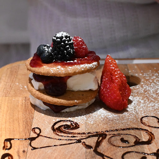 We ended up getting two cheesecakes (wildberry and pistachio) as dessert. It took a little longer than we expected, but when it arrived, it was apparent that the wait had been for something beautiful. Presented were the two cheescakes on a wooden board with a very cute chocolate drawing of me and my partner. This left a very strong positive impression on us. The cheesecake was tasty. The pistachio flavouring was warmed up, while the wildberry flavoured one was cool, and both had great flavour, with the wildberry having fresh, delicious berries on the side.
