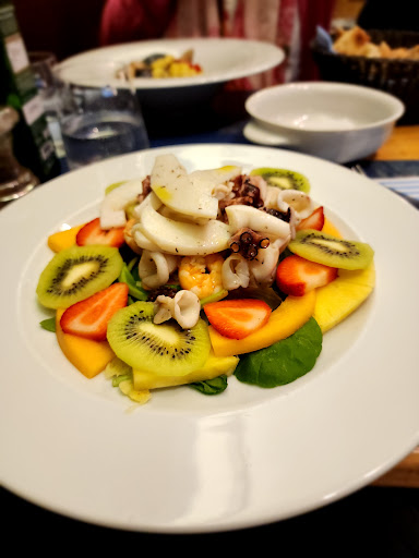Now for the food: No words can adequately express how much I love their food. They are so innovative! I had the tropical seafood salad for my first course, and the tuna tataki for the second course, as recommended by the owner. The salad was mixed seafood on top of sliced fruit. It was gorgeous look at, and that fruit and seafood combination was surprisingly wonderful! The tuna tataki was seared perfectly, and the sesame seed crust was a perfect compliment to the fish. It was also served with guacamole and caramelized onions. My companion had the seafood and gnocchi for first course and the octopus for second course. The gnocchi was so soft and pillowy, and in a seafood sauce that was out of this world! The octopus was probably our least favorite dish, but it was still quite good. I think I just like the flavor of grilled octopus better. Lastly, we had a Berry Charlotte that was very pretty and tasted like an excellent mixed berry trifle.