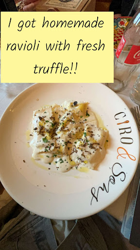 Read moreI can't say enough about how wonderful this establishment is. We try to go to a different place each time we go out while traveling, but we had to return to Ciro & Sons. My sister has a gluten intolerance and it can be difficult to find quality gluten free options. This restaurant offers a gluten free options for everything on the menu and the quality does not lessen!! The whole service team is so pleasant, smiling, attentive, and made excellent recommendations when we struggled to choose. Our main server today was Alex and he was fantastic. When bringing out the main courses, of our group of 10, two people got the same dish and one was my gluten free sister. The sticker denoting the gluten free was set in front of her and it was covered by a special lid to grate your own cheese over the top. When they lifted the lids, Alex immediately recognized the different noodles and caught how the gluten free was mislabeled. Thankfully they hadn't eaten yet, but wow was he on top of it!! Easy mistake to mislabel with the sticker in a busy kitchen, but thankfully the serving team has people like Alex who know the menu well and can visually double check!! I can't say enough about the excellent food, you'll have to try for yourself to understand, but this visit I had their handmade ravioli with fresh truffle and white sauce and I do not exaggerate when I say it is hands down the BEST ravioli I've ever had!! Heavenly. Absolutely heavenly. Please try it...