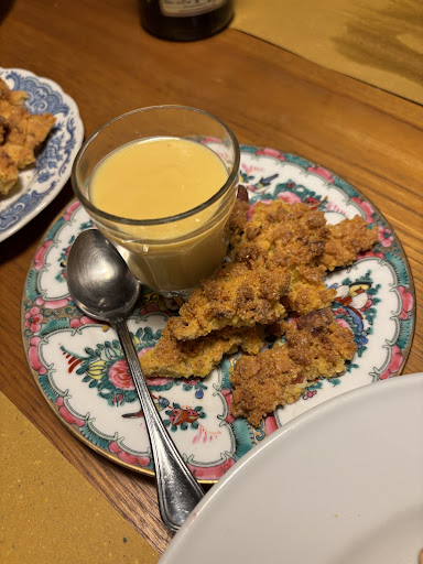 Last night we dined at C-ucina, a restaurant on a quiet street just outside the city walls of the Oltrarno. Clean, spacious, attractive with pleasant lighting and, thank goodness, music at a low volume, we enjoyed a memorable meal. My companion tried 'passatelli', an old-fashioned and overlooked dish of delicious mixed-meat broth with made-on-the-spot soft noodles of breadcrumbs, eggs, cheese and seasonings pressed through a ricer and a sprinkling of citron rind. My first course, 'acciugata con puntarelli', an emulsified dip made of anchovies and a light olive oil, was served with crisp chicory shoots. Onwards! Next we shared an ample main course of 'stracotto', a tender pot roast, with polenta taragna - that's polenta made of corn and buckwheat meal. Panna cotta with pear in red wine followed with crunchy 'sbrisolona', cookies made of cornmeal, almonds and butter. It was a wonderful, mellow evening and meal with attentive service by the architect-cook-owners. We will...