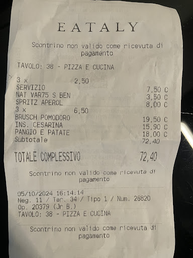 Read moreThe person at the front of the restaurant (not pizzeria) was horrible and rude. If we hadn’t missed lunch and were running somewhere else, we would not have stayed. She told me sharply to wait by the stairs when there was no one in front of her and there weren’t many diners. I gave her the benefit of the doubt and thought maybe her English wasn’t good and it’s not intentional that she was coming across rude. A mistake on my part. They served us crusty old bread that I could hardly bite, and a terrible Caesar salad. Things are definitely priced higher here too than what you can find elsewhere for better in Florence. I ordered an Aperol spritz and it nearly didn’t come. I asked for anchovies that never came. When I asked her for the bill, she pretended not to hear me and then pointed go to the checkout and said in a rude way to go over there when I asked again. She told me the price without giving me a receipt and I had to ask for the receipt which she didn’t like. But I wanted to make sure that the anchovies wasn’t included since it never came. It was a mistake to come here as I’ve loved Eataly in USA and Canada and felt it would be a trustworthy experience that I could share with my...