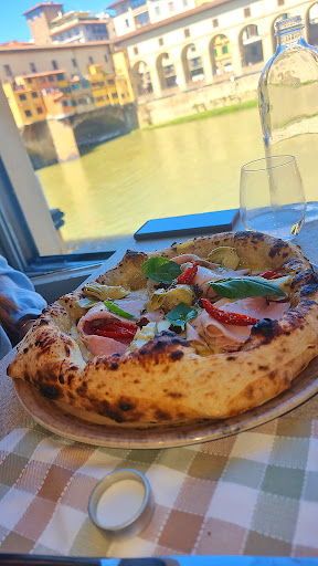 Read moreAllora fare questa recensione per me è molto difficile perchè ci sono troppi elementi contrastanti.. Partiamo dall'arrivo. Siamo stati accolti molto calorosamente e molto gentilmente. Ci hanno accompagnato al tavolo e con nostro grande stupore e piacere abbiamo notato che ci avevano riservato il tavolo migliore della pizzeria. Vista su ponte vecchio e sull'arno, con finestre che si aprivano verso l'esterno il che permette di far arieggiare il posto e soprattutto di goderti al meglio il panorama. Camerieri gentili e attenti. Andiamo alle portate. Abbiamo ordinato un tris di montanare,un crocche e un arancino ed una frittatina. Il tris di montanare sono arrivate fredde e i loro topping era un po andato,in particolare la crema di pecorino,sulla montanarina alla carbonara,che ho trovato abbastanza acida. L'impasto era molto molto fitto e aggiungendoci il fatto che erano fredde ha reso difficile la masticazione e le deglutizione. Crocche e arancino deludenti. Panatura fine,sugo del riso abbastanza anemico e anche troppo cotto,crocchè con fecola di patate senza prosciutto e abbastanza insipido. Buona invece la frittatina,nonostante fosse fredda ho apprezzato la pastella fatta bene,si sentiva la provola,besciamella,piselli e pasta alla giusta cottura. Arriviamo alle pizze. Abbiamo ordinato una vesuviana e una capricciosa. Qualità degli ingredienti della capricciosa di qualità! Su tutti ho molto apprezzato il cotto arrosto e i carciofi,che fortunatamente erano stati fatti sgocciolare a dovere cosi da perdere olio e aceto in eccesso. La vesuviana aveva un buon fiordilatte e una buona passata di pomodoro anche se l'ho trovata troppo delicata(gusto mio personale non è detto che sia un difetto) Il problema principale secondo me è l'impasto! È veramente molto pesante,cornicione contemporaneo ma troppo fitto e poco alveolato e soprattutto poco lievitato! Pizza veramente poco digeribile che sia durante la masticazione ma anche ore e ore dopo si fa sentire! Raramente mi capita di finire con fatica una pizza.. Credo debbano investire di piu sulla lavorazione dei panetti,sulle farine utilizzate e sul processo di lievitazione perchè non posso negare che tutti si danno molto molto da fare! Il servizio è stato velocissimo e quando sono passato a pagare ho notato comunque tanti ragazzi giovani volenterosi e impegnati a dare il 100%! Mi dispiace fare questa recensione perchè avevo grosse aspettative ma devo ammettere che hanno bisogno di rivalutare il loro impasto e magari anche di puntare ad una pizza tradizionale napoletana e non alla contemporanea che ha troppe complessità e criticità da gestire. Non pubblicherò questa recensione anche sui miei profili e canali sul food perchè i ragazzi comunque sono dei gran lavoratori e persone gentili! Dispiace! Conto secondo me in linea con...