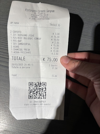 Mains Jajangmyun: the sauce was decent but the noodles were practically baby food level mushy. Also lacked meat but had lots of potatoes. 2/5 Naengmyeon (cold noodles): came WARM. This was probably the most frustrating part as I expected to eat a refreshing bowl of cold noodles (didn't need the classic ice in there but at least just have it cold). Soup was way too bland to even bother drinking (did I mention it was warm?) And they don't provide vinegar or hot mustard. Noodles were slightly chewy which is good and they top with egg, beef, carrots, and apple (normally Asian pear but I imagine sourcing in Italy isn't easy so they get a pass here) 2/5 Bibim Naengmyeon (spicy cold noodles): came WARM (notice a pattern). Basically copy the Naengmyeon review but add spicy sauce to it. 2/5 Bulgogi Kimbap: the cost is what doesn't justify this dish as its so basic and costed about 10euros (which to CAD is about $14ish dollars which we get back home for about 5euros) so this was a turn off right off the bat (but when you're craving Asian food, the stomach overrides the brain). Meat was limited, but was overall fine as its just a Korean sushi roll. Will say they missed by not brushing over with sesame oil and sesame seeds. 2.5/5