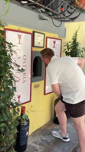 Reservations are suggested, as we had, or you can wait, and if you wait, you can have a glass of wine via the “Wine Window”. For some, this alone is with the trip. We did both for the full experience.