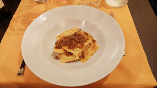 The next dish was Tortello with Tuscan ragù—it was absolutely delicious. Thin pasta filled with a wonderful potato-based stuffing, topped with Tuscan ragù—simply finger-licking good.