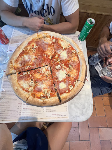 We found this place online after a long day of walking at the Piti Palace and Boboli Garden. It’s to the left of the palace about a minute walk down the block. Small place so if you are a larger party you might have to sit in separate tables. We didn’t mind to sit in separate tables as we wanted to try a good local place. We waited about 15 minutes a for a couple of tables to clear up. The waitress was very accommodating and arrange 3 chairs per table. Hands down the best pizza we have had in Florence. They make the pizza as you order it , it’s very fresh. We ordered the maxi size prosciutto and mushroom pizza. Plenty for 2-3 people. Leave room for dessert and try the “Cantucci al vin...