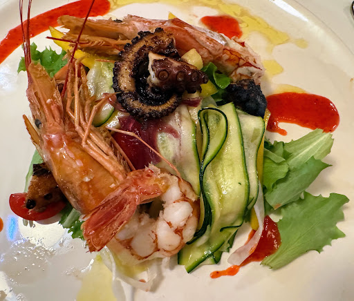The highlight was the octopus shrimp salad. The octopus was grilled / charred, tender and flavorful. The rest of the salad ingredients balanced each other splendidly. This was the best thing we ate during our whole week in Italy. Ingredients included: octopus, shrimp, strawberry puree, mango and pineapple slivers, mixed lettuce greens, celeriac and cucumber ribbons, cherry tomatoes plus a light vinegar and oil dressing. I had ricotta and spinach gnudi dumplings with bacon and my husband had a pasta dish with shrimp and truffle.