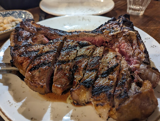 Bistecca Florentina- delicious, juicy meat on the bone. Clearly cooked over a high temperature wooden grill- the outside is seared, the inside is pink, and somehow the bone has a perfect char too it. Barely a bit of gristle or fat on the outside but tender and delicious. Keep in mind the smallest steaks they offer are 1-1.2 kilograms, and the meat is priced by weight.