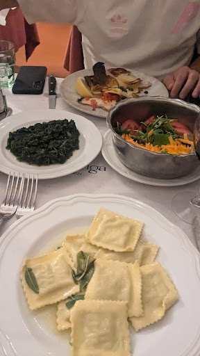 For Italian standards, the food was okay. The bruschetta was fresh and lovely, for the main I ordered the Ravioli with butter and sage, which was very obviously freshly cooked with good ingredients however it was obvious something was missing as it was quite bland and lacked a lot of flavour. Also the mixed greens with oil and garlic was incredibly salty and stodgy. My partner had fish with potatoes, whilst that tasted good the fish had a lot of bones and scales left behind.