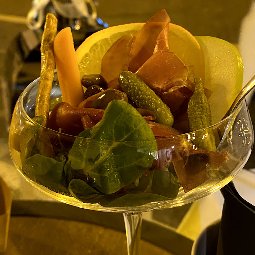 Ottima la presentazione, viene un ragazzo molto gentile che ci serve lo spritz e aggiunge una quantità pari a un dito di champagne davanti a noi, mescolando con l’attrezzo apposito e ci servono tarallini e olive ... ordiniamo un tagliere, ma forse non ci siamo spiegati bene e ci viene portata una coppetta con dentro una fettina di bresaola unita a olive e cetriolini, mela e arancia, bello da vedere e buono, insieme a una ciotola con pezzi di piadina