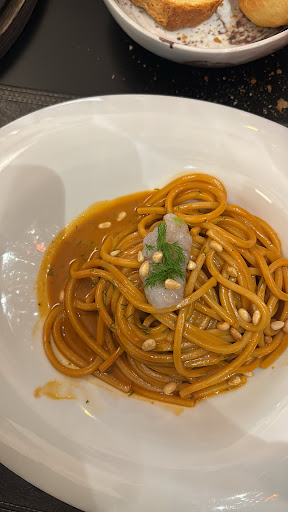 Non ho scelto personalmente le portate, ho preferito affidarmi allo chef e ho trovato l'entrée e l'antipasto gradevoli, sebbene non particolarmente memorabili. Tuttavia, il primo piatto, uno spaghettone con tartare di scampi, il suo ristretto e finocchietto, è risultato particolarmente apprezzabile per la sua freschezza e creatività. La preparazione dei piatti riflette una cura nella scelta degli ingredienti e una buona tecnica culinaria.