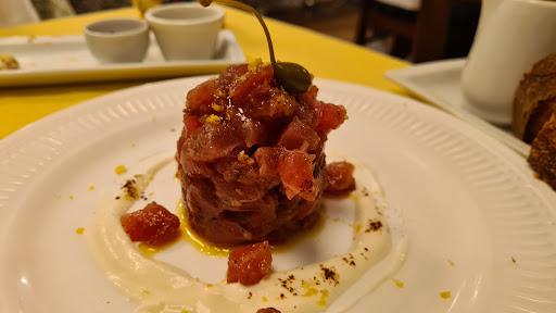 Read moreDopo aver letto le altre recensioni sono giunto alla conclusione che il problema non è nel locale ma nel target che frequenta il posto. Perché non mi spiego in altro modo i plausi enarrati rispetto al conquibus ricevuto. Vi racconto la serata: entrati nel locale, la prima sensazione è di "freddo": eppure con il freddo che fa avremmo dovuto notare una piacevole "differe6di temperatura". Non siamo gli organizzatori della serata (per fortuna), ma portati da amici (che non mangiano pesce) per provare il locale. Ci comunicano che "oggi si mangi solo pesce, lo sanno tutti"! Purtroppo alla prenotazione non era stato detto e per tutti noi era la prima volta. Dopo molte insistenze a trovare una soluzione sembra "per grazia ricevuta" esseresi trovata una carne. Veniamo consigliati a scegliere un vino (rosato secondo nostro desiderio) secondo una logica di apparente competenza sui biologici (malgrado il mio scetticocismo su questa tipologia): una gazzosa! Fortunatamente in tanti finisce presto e scelgo il vino giusto. Ordiniamo 5 antipasti e un primo da portare insieme: il primo antipasto freddo arriva subito, gli altri scaglionati in circa un'ora. Poi arriva uno dei secondi (una frittura fredda), ma del primo che doveva arrivare insieme agli antipasti nessuna notizia. Alle nostre rimostranze vengono bloccati i secondi ed arriva finalmente il primo. La frittura di pesce fredda viene riscaldata nel microonde (immaginate il risultato) e portata insieme agli altri secondi (finalmente una coordinazione nel servire). Tra i secondi c'erano degli involtini di pesce spada su un letto di patate: peccato che queste ultime erano fredde (gli involtini buoni). Arriviamo ai dolci: tiramisù all'amaretto. Affondato il cucchiaio sembra tutta panna: manca il savoiardo (o pavesino). Capisco le rivisitazioni, ma avvertite! Il personale è simpatico e disponibile, lo/la chef estrosa e volenterosa, ma nell'insieme sembra una combriccola di dilettanti allo sbaraglio. Fortunatamente il conto non è stato salato: meno...