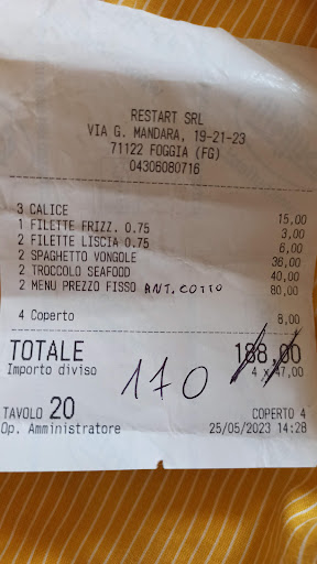 Read moreSabato sera, con una comitiva numerosa, abbiamo provato questo ristorante di pesce. Purtroppo per la proprietaria siamo assidui frequentatori di ristoranti, specie fuori Foggia, e di esperienza, haime' ne abbiamo. Questa per noi, e' stata un' esperienza molto negativa da non ripetere assolutamente, sia per la qualità del cibo (i ricci di mare "profumavano" di ammoniaca, il carpaccio era del tutto insapore, ecc...), sia per le porzioni estremamente esigue(qualche piattino qua e la, non certo sperlonghe ricolme!) sia per il conto eccessivamente esoso: 1.960,00 euro, senza aver mangiato ne' primi piatti ne' secondi, solo antipasti. Anche il conteggio del numero delle bottiglie di vino ordinate non giustificava l'importo richiesto. E' vergognoso che un ristorante approfitti di una circostanza di confusione e di poco controllo, data la comitiva numerosa e la presenza di bambini, per presentare un conto indecente. Una rapina senz'arma! Da segnalare alle autorita'...