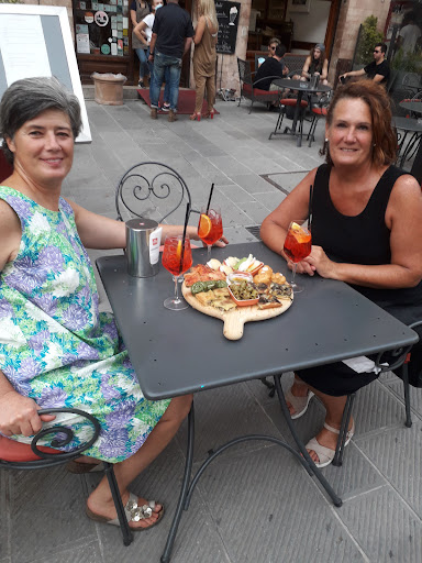Read moreEn el centro medieval de Foligno, una ciudad muy moderna, al lado de la catedral y del fabuloso museo del palazzo Trinci, encontraréis este divertido local. Se trata de un establecimiento difícil de clasificar. ¿Es un café, como un bistró francés? Puede, tiene el aire y el café que se sirve aquí es superior, en todas sus variedades. También parece una enoteca, las paredes del local llenas de buenos vinos de la tierra. O una pastelería con mesas de degustación porque disponen de dulces de todo tipo. Pero también podría ser un bar con su terraza exterior abierta a la gran plaza. El caso es que ofrece comida, buena pasta, tablas de embutido y quesos, y otras delicias. La decoración responde a todas estas descripciones: mesas sencillas tradicionales de bar, una gran barra, botellas y más botellas, aparadores con pasteles y amplios ventanales. El servicio, muy familiar, es amable y eficiente. La comida estuvo bien el primer día. Mi tabla de embutidos era generosa, en variedad y cantidad. Y las verduras a la brasa sabrosas. Pero al volver el día siguiente la cosa cambió de golpe. La tabla de embutidos era más pequeña, con menor variedad, (faltaban jamón y panceta). Tampoco las verduras eran lo mismo. Menor variedad, tamaño menor y se echaba en falta la "melanzane". Por ello no sé a qué carta quedarme. En todo caso es un lugar recomendable para comer y los vinos son fantásticos. Los postres...