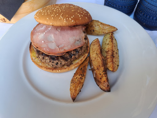 I due menu che abbiamo ricevuto davano già l’impronta del locale: rilegati in una cartella similcuoio bianco, molto sporchi ed appiccicosi, non davano per niente voglia di essere toccati; immagino che non siano stati mai lavati. La carta propone diverse cose che sembrano molto sfiziose fra primi, secondi, hamburger e pinse. Abbiamo preso due hamburger diversi; quando sono arrivati alla vista sembravano già molto scadenti, pane dozzinale, molto asciutti, quattro patate da contorno. Speriamo siano buoni! No, tutti ingredienti di pessima qualità, panino nel complesso secchino e per niente goloso, carne(?) mal e troppo cotta; impressionante poi come tutto (non) avesse lo stesso gusto… Ci siamo anche scambiati gli hamburger senza gustare la minima differenza… Prezzi esagerati visto gli ingredienti da discount. La terrazza dove eravamo seduti seguiva lo stesso canovaccio, tutto un po’ sporchino, meschino, senza grande appeal… Recandomi al bagno ho attraversato la sala che ad una vista veloce sembra molto più curata e decisamente più invitante ed accogliente. I servizi igenici veramente pessimi: vetusti nell’insieme, ma soprattutto estremamente sporchi, la porta d’entrata, il pavimento, i servizi… il piede del WC veramente sudicio, distributori di sapone, di fazzoletti e sciacquone rotti o mal funzionanti, non sono stato in grado di tirare lo scarico che perdeva… Speriamo che la cucina rispecchi la sala interna. Nel complesso non ci tornerei e non lo consiglierei a nessuno, almeno per quanto riguarda la ristorazione, pessima e priva d’amor proprio. Due stelle, una perché chi ci ha servito è stato gentile e sorridente, la seconda perché non siamo stati male...