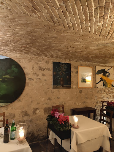 Ambiente: La cura del dettaglio del locale e la ricercatezza si presentano già dall'insegna di ingresso. Entrando si viene accolti da un ambiente elegante e raffinato, ma allo stesso tempo caldo e romantico; travi in legno, soffitti e pareti in pietra contribuiscono a donare rusticità e un tocco retrò. Curati anche gli spazi secondari del locale