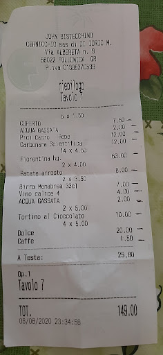 LA REGINA DELLE CARNI Dopo una meravigliosa giornata in barca, ci fermiamo a cena a Follonica. Questa sera abbiamo prenotato da John Bistecchino per una scorpacciata di carne! Si tratta di una Fiorentineria...fate un pò voi. Il locale è molto carino, ma molto, molto piccolo. All'esterno è presente un dehor altrettanto piccolo che noi dieci occupiamo completamente. Veniamo accolti in maniera decisamente calorosa, il personale è adorabile. I nostri ragazzi in un tavolo e noi adulti in un altro a fianco. Svariate bottiglie di acqua, un paio di bibite, il solito cestino di pane sciapo ed un paio di bottiglie di vino. Scegliamo un Maremma Toscana Rosso Doc Barbaspinosa della Tenuta Morisfarms di Massa Marittima (GR). Perfetto da abbinare alla nostra cena. Giusto per scaldare i motori ordiniamo un paio di taglieri di Affettato di Black Angus ed una Selezione di formaggi. Affettati di carne bovina americana marinata ed affumicata. Molto buoni. Formaggi di qualità notevole serviti con la loro marmellata, il miele e la giardiniera. Tagliere di formaggi, forse, un pò...minimal. Per i ragazzi tre Tagliate spettacolari, un piatto di Pici cacio e pepe ed una Carbonara scientifica (scienza, a detta loro, applicata alla cottura dell'uovo). Tutte le proposte decisamente convincenti. Ed ora a noi! Il menù dedicato alla carne, ben esposto sopra le nostre teste, è molto invitante e tocca varie nazioni. Decidiamo per una classica Fiorentina della casa e poi azzardiamo una Sashi Fiorentina di origini finlandesi. Carni servite su piatti caldi in ghisa, cotte perfettamente, con una goduriosa crosticina esterna ed all'interno un bel rosso vivo. La consistenza della carne? Uno spettacolo! Carne italiana meravigliosa, ma devo dire che anche la finlandese si è difesa molto bene. Va detto, però, che non trovo realistica l'enorme differenza di prezzo. La finlandese 25 euro in più al chilo!!! A questo punto, tutta la vita la Fiorentina made in Italy. Come contorni una porzione di Fagioli lessi ed una di Patate al forno. Tutto molto bene. Chiudiamo con un giro di dolci, tutti fatti in casa. Un Tortino caldo al cioccolato, due Crostata con marmellata di more e ciuffetto di panna (spray) ed altri due Brownies al cioccolato. Dolci scelti dai ragazzi che vedo tutti soddisfatti. Ancora quattro caffè, altrettanti ammazzacaffè ed infine il conto. La spesa totale è pari a 357.50 euro con questo dettaglio: i coperti (ahimè) 15 euro; cinque bottiglie di acqua 9.5 euro; due bibite 5 euro; i due Barbaspinosa 50 euro; due taglieri di affettati 24 euro; la selezione di formaggi 10 euro; tre tagliate 48 euro; le due paste 24 euro; la Fiorentina della casa (45 euro/kg) 60 euro, mentre la Sashi Fiorentina (70 euro/kg) 81 euro; i dolci 25 euro; quattro caffè 6 euro ed ammazzacaffè gentilmente offerti. Abbiamo trascorso una piacevolissima serata coccolati dal personale del locale, in particolar modo da Simona che ha avuto una pazienza infinita....