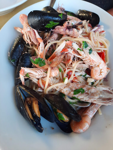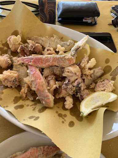 Read moreMenù fisso da 25 euro o 30, abbiamo scelto quest'ultimo. Antipasto di 3 portate esageratamente salato composto da tutto ciò che costa poco: alcune cozze , discrete , lupini (le vongole piccole) al sugo , crostini con pomodoro e aglio con qualche traccia di pesce. Ben 2 primi : spaghetti assolutamente asciutti ed insipidi sempre con i lupini e risotto di mare fatto con molto di ciò che al mercato costa meno e che pertanto è pure difficile da sgusciare e mangiare ,quindi rimasto nel piatto. La frittura poi.....neanche nel vostro giorno peggiore riuscirete a fare qualcosa così intriso d'olio da rimanere in circolo per i prossimi 20 anni. Dolce speciale ed estremamente complesso: cucchiaiata di ricotta con Nutella sopra. Caffè della moka. Ah, vino della casa (lasciamo perdere) acqua gassata di marca ignota. Sala comunque sul mare con bella vista e sudore gratis a volontà, visto che se non tira vento schianti di caldo ed il condizionatore non lo accendono....