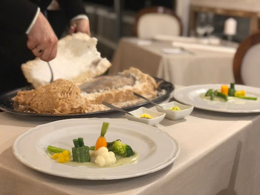 Addedum: The fish of the day baked in a salt crust was amazingly tender; BUT! WHY do you send out the plates with the accompanying vegetables at the same time, knowing that it will take at least 5-10 minutes to prepare the fish? By the time the plates were in front of us, the veggies and the vegetable (?) cream were...