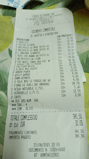 Read moreDella serie il riso è cotto lo puoi scolare. Iniziato bene finito male. In 4 persone iniziamo con 4 frittini e prosecco offerto "forse" dalla casa 2 antipasti di cui 1 carpaccio di tonno e mozzarella ottimo e polpette di pesce che sarebbe meglio definire di pepe perché l'unico sapore riconoscibile era quello 1 primo a testa di cui 1 fettuccine gamberi e zucchine che in qualsiasi trattoria o take away di Terracina fanno sicuramente meglio io compresa che non sono uno chef stellato risi cozze e zafferano per 2 alla modica cifra di 26 euro con 6 cozze e a dir tanto 40 grammi di riso per 1 che se pure ci avreste messo 30 grammi di riso in più non credo che sareste falliti 4 dolci. Per carità buonissimi una bottiglia di traminer il tutto per 37 € a persona a mio avviso € 25 sarebbero stati più che sufficienti. Servizio tovaglie di carta vino nel secchiello del ghiaccio senza tovagliolo anche io che non sono uno chef me ne sono accorta anche perché nel prendere la bottiglia mi sono bagnata. €. 37 sono...