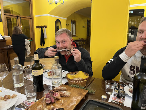 We chose to overnight here due to the good reviews on this site. We really wondered if we had gone to the wrong hotel! The owners are very nice, but extremely scruffily dressed and didn't change their clothes while we were there. The rooms are basic, but comfortable and clean. However, we were expecting a wonderful dinner in a family style location, and the reality was very different.||||The dining area is huge with only about 20% being used giving a cold, unused feeling to the downstairs area. It is cold and dark with nothing homely about it. We were served a lovely pasta dish to start which we enjoyed and were looking forward to an Italian culinary experience. This didn't happen. The pasta was as good as it got. We were served and a lump of meat and a side salad drenched in vinegar! That was it. Then some fruit was put on the table, considering of apples and one pear. We were starving so we asked for some cheese. We were presented with a 3 tiny slices of home made cheese and again that was it. We ate the bread basket and went to bed hungry. Throughout the meal, the son and daughter sat behind a desk staring into space with looks of total boredom on their faces. Very off putting! ||||Breakfast was a cup of coffee and a pastry! That was it.... Hungry again.||||We were presented with a bill for €20 each for the dinner plus an additional €5 for the cheese, plus €10 per bottle for the home made wine. We felt ripped off. ||||It's hard to write a bad review for the Tenuta as the family were very nice people, but they could really up their game without too...