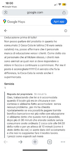 Allego screen della precedente recensione in quanto non mi permette di rispondere. Andiamo per punti: non è un discorso di prezzo, era per sottolineare che i clienti scelgono i bar non per quello che vendono ma per il servizio; Il commento è parzialmente vero, mi spiego meglio: siamo arrivate in 2 momenti diversi bar, nel primo (locale attivo con circa 10 tavoli con persone che consumavano) è stato chiesto gentilmente di pagare con bonifico istantaneo, richiesta anomala, lo comprendo, che può essere tranquillamente declinata. Ciò non è successo, ci hanno lasciato lì per 30 min senza una risposta. Ci siamo alzate e siamo andate a prelevare, siamo ritornate nel locate e abbiamo ordinato, se accettate la comanda immagino che il locale possa servire ciò che abbiamo chiesto (sempre 2 lattine di Coca-Cola). Dopo circa 20 min la Coca-Cola non arriva e chiediamo ad una ragazza, la quale ci guarda ride e continua a scherzare con il collega. Ci siamo avvinciate per capire se non avesse capito o altro, e in faccia ci ha riso e ha continuato a pulire, a quel punto l’affermazione da parte della sottoscritta è stata: “parlo da collega, se questo è il modo di trattare i clienti fidatevi che non è mestiere vostro!” Cari signori, non è il cosa ma il come che fa la differenza e la risposta all precedente recensione dimostra che la cura del cliente non è nei vostri punti di forza. Detto ciò vi auguro tante cose belle e un corso di comunicazione. Maria...