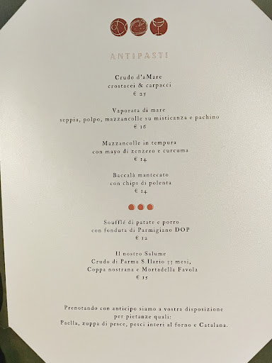 Antipasti, primi e secondi di mare sempre ben presentati e cucinati con tecnica, senza coprire i sapori. Ogni piatto ha una sua identità, e si percepisce l’attenzione ai dettagli. Anche i dolci sono all’altezza, perfetti per chiudere la cena senza appesantire.