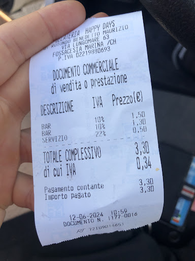 Read moreSENZA avvisare prima che ci sarebbe stato un costo per questa cosa, mi hanno fatto pagare 50 centesimi per il servizio, ovvero portare il caffè al tavolo a 2 metri di distanza. A Milano, seduto, caffè e cornetto Pago 1,50 e 1,50. Totale 3. Attività come questa, che ripeto, ai limiti della legalità questa cosa, non hanno avvisato del costo, a mio parere in Italia dovrebbero stare chiuse perché rovinano la reputazione della categoria. Consiglio alla proprietà: non sapete mai chi si siede al vostro tavolo, magari un giorno è un parente di un finanziere in trasferta o magistrato che ha voglia di far rispettare la legge al millimetro, come infatti si dovrebbe fare per far andare avanti sto paese e non approfittarsi sempre del prossimo. Se non volete farlo per correttezza, cerchiate di essere onesti anche solo per questo...