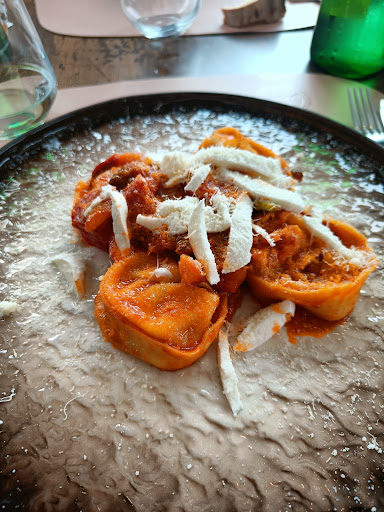 Ho mangiato: Tortelloni ripieni di grottone, maialino nero casertano, con pomodoro, guanciale e straccetti di mozzarella: squisiti, bilanciati perfettamente, si sentivano tutti i sapori. Paccheri con crostacei e frutti di mare al cartoccio: molto molto buoni, arrivano con un cartoccio a forma di cigno. I paccheri sono generosi, molto saporiti, il pesce buono! Bistecca del menu del giorno: bella grassa, cotta molto bene. Buonissima. Tortino con cuore di cioccolato fuso: non aveva purtroppo il cuore fuso, gusto normale, niente di eccezionale.