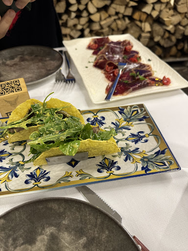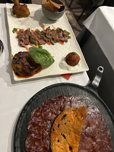 ….. un ns caro amico ci era già stato con la moglie, quest’estate e aveva mangiato un’ottima pizza, ma era rimasto favorevolmente colpito sia dal locale sia dalle materie prime esposte, su tutto le carni, nazionali, straniere, tagli importanti di grandi allevamenti, in bella vista nei loro frigoriferi per la frollatura Ci dobbiamo andare insieme, voglio condividervi la ns bella esperienza Ieri, 08/12/2023, in occasione della festività, prenota x 6 La location in una bella dimora storica di Frascati con vista mozzafiato sulla valle fino a Roma, facile da raggiungere e con ampi spazi all’esterno x godere del panorama Noi ci accomodiamo all’interno, l’arredamento sobrio e minimalista, si intravede la mano di un architetto che ha voluto inserire delle piccole caratterizzazioni brutaliste, nuova corrente architetturale che premia le opere in cemento grezzo e la pietra viva ed esalta i ferri di armatura che ne sono elemento costruttivo, le armature ed il cemento rivivono di nuova vita seguendo invece il processo di wellness, concept americano di tendenza che si preoccupa del benessere nei luoghi di lavoro, convinti che le piante ed il verde in genere infondano la serenità e la tranquillità nelle Risorse umane e negli stakeholders che ci vivono, x un migliore e più produttivo risultato lavorativo, con piante che si riappropriano della struttura cementizia Il nostro tavolo rettangolare x 8 persone, elegantemente tovagliato, con una impeccabile mise en place, preludia alte aspettative che speriamo vengano confermate durante il pranzo Un bel calice di prosecco, delle bruschette calde con un buon olio evo ed un po’ di Parma 24 mesi tagliato a mano ci mettono di buon umore, poi visto che ci offrono anche del Pata Negra lo assaggiamo volentieri, confermata la bontà delle materie prime e dell’entrée, ci organizziamo con la comanda per il pranzo La scelta è variegata e l’imbarazzo e forte, ma ci facciamo coraggio, il tagliolino con doppio carciofo, guanciale croccante, mentuccia romana e pecorino, convince tre di noi, poi uno gnocco fatto in casa di patate arancioni americane, con crema di taleggio, noci e radicchio piastrato, per mia moglie tagliolini al tartufo fresco e per il nostro amico solo dei porcini alla piastra Nessun dubbio invece sul vino, km 0, “Bacca Rossa” 2021 di Poggio Le Volpi, di cui conosco personalmente la cantina, un grande Rosso Lazio IGP, vincitore di importanti premi La presentazione dei primi che ci arrivano subito dopo e bella, curata con evidenti tocchi gourmet, ci scambiamo gli assaggi e le materie prime la fanno da padrone, il carciofo ed il guanciale croccante rendono spaziale un tagliolino di generosa quantità le paste sono ben legate e saporite, ottimi gli gnocchi, hanno convinto mia moglie il che è tutto, ottimo anche il tartufo che inebria un ottimo tagliolino, siamo tutti molto contenti della ns scelta e ci apprestiamo ad assaggiare i secondi Io ho preso una guancia di vitella cotta a bassa temperatura su fondo bruno aromatizzato al barolo con purea di broccolo romano, scenografica presentazione con il cameriere che mi serve il fondo caldo con un bricco, un gusto ed una tenerezza fuori dal comune, fantastica Il mio amico prende una tagliata, cotta alla perfezione, sigillata esternamente, rossa viva la carne che rilascia i suoi succhi di una tenerezza insolita, grande piatto Poi arriva un bel piatto di portata con una ricca selezione dei migliori formaggi della casa, prelibati e preziosi, delle patate al sale, delle puntarelle e una vellutata di ceci, chips di pane e bacon croccante, tutti di notevole preparazione e di ottimo gusto che accompagniamo con la seconda bottiglia di Bacca Rossa Poi due desserts, Crostatina con crema pasticcera, frutti di bosco e meringa flambè Semisfera Fondente Cremosa allo Zabaione e Croccante di Arachidi, entrambi deliziosi e golosi Bellissima scoperta ed esperienza da ripetere Complimenti e alla prox...