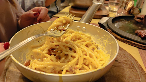 Tempo fa, sono stata invitata ad una cena tra amici, abbiamo prenotato per il turno delle 8, e nonostante la maggior parte degli invitati avesse già preso posto e mancassero solo due persone, ci è stato più volte chiesto di sollecitare l’arrivo degli assenti, che alla fine sono arrivati con appena 10 minuti di ritardo. Durante la serata, il personale ci ha suggerito più volte di accelerare le tempistiche sentendoci costretti a mangiare di fretta, anche se la cena alla fine si è conclusa nel giro di un’ora, quindi entro la fine del primo turno. Sebbene l’idea di mettere le padelle al centro e sporzionare autonomamente i primi piatti sia stata molto apprezzata, non si può dire lo stesso per la carne, in quanto ci è stata portata sulla pietra e abbiamo quindi avuto difficoltà a sporzionarla perché era ingombrante e oltretutto la carne risultava fredda, è stata poi servita come “pezzo unico” che poi NOI abbiamo dovuto tagliare , non rispettando le grammature che erano state chieste. Inoltre, in un ristorante di solito le persone sono libere di scegliere quello che più li aggrada, non ci siamo sentiti liberi di farlo in quanto la cameriera ci ha detto di scegliere dei primi uguali per agevolare la cucina. Cosa che non mi sembra giusto visto che se una persona voleva assaggiare qualcos’altro, non l’ha potuto fare. Avevamo ordinato un antipasto che potesse bastare per tutti gli invitati, quando invece ce ne è stato servito uno che bastava per appena la metá; alcune persone hanno ordinato “pasta zucchine e pistacchio”, ma il piatto sapeva solo di pasta in bianco, gli ingredienti erano completamente slegati. Infine, avendo tra gli invitati una vegetariana, è stato chiesto in anticipo se si poteva concordare un secondo vegetariano, visto che sul menu (ribadisco dei secondi piatti) non c’erano opzioni che non includessero carne, alla luce di ciò ci è stato risposto testualmente “guarda il menú”. Aldilà della location curata, credo che la recensione spieghi al meglio la valutazione finale...