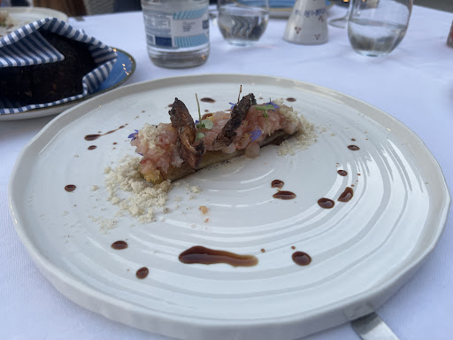 Read moreCategory: Seaside bar/restaurant. After walking down the seemingly endless steps from our villa to the beach, we were ready for some day drinking. This restaurant has a great outdoor patio overlooking the small beach but we only wanted drinks so we sat inside. A wedding was held there the night before, so the windowsills were festooned with white roses (don’t expect fresh roses all the time). It was a hot day, so the cooling breeze wafting through the wide open restaurant interior, and its shade, were as welcome as our cocktails were refreshing. The interior is dominated by a long, decorative fishing boat beneath stone arches with a mural of the sea view. With white, wood-topped tables and blue-and-white tile, I’d say the place has a great Mediterranean feel if that didn’t seem redundant in view of its location. But it does. If we had worn our swimming togs we could have had a dip and sip, enjoying both the sea and drinks 🍷. Looks like a good place for dinner too. YouTube’s...