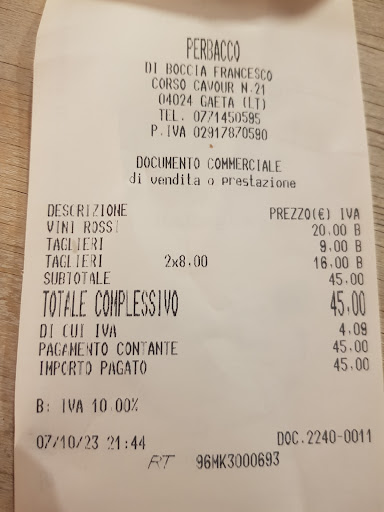First the people, Franco and Kiara, they are extremely friendly, knowledgeable, and take great care and pride in what they do. Second is the atmosphere and ambiance. It is a cozy, quaint wine bar and a meeting place for many local Gaetians, very welcoming, relaxing and comfortable. Lastly is the food and drink. Of course you expect amazing wines and you will not be disappointed, but there is also a variety of mixed drinks and beers. While the menu may be small compared to other places, each dish is superbly crafted and delicious; offering refreshing alternatives to the basic Gaeta restaurant fare. Kiara is delightful and a master in the kitchen. Franco is the master of the wines and will pair a wine perfectly with the meal and occasion. PERBACCO has become a establishment that I will visit over and over again. And I encourage all who love good wine, good food, and good atmosphere to...