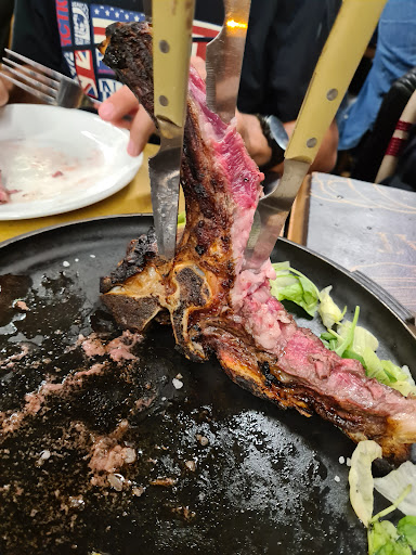 Giovedì sera 14/08/20, prenotato nel pomeriggio con largo anticipo per le ore 22 per 6 persone, arriviamo con 5 minuti di ritardo e chiediamo il tavolo e ci fanno aspettare 30 minuti nella confusione più totale del personale e ovviamente il nostro. Dopo questo lasso di tempo spropositato ci assegnano un tavolo, apparecchiato con solo 3 coperti, chiamiamo il cameriere che alla seconda chiamata ci risponde che non può prendere le ordinazioni in quanto mancano le stoviglie e posate pulite, rischierebbero di portarci le ordinazioni senza averle, nel mentre si avvicina un gruppo di persone che lamentano la proprietà del tavolo da noi occupato, rimandiamo l'accusa al cameriere che ci ha fatto accomodare che con aria perplessa guarda ambo i gruppi e con risposta fugace da la colpa ad un'altra collega, è tutto un dire sul servizio offertoci. Riusciamo a fare le nostre belle ordinazioni dopo 1 ora esatta dal nostro arrivo e anche con qualche mancanza (sia sulle bibite che sul cibo) un po di frittini come aperitivo e un paio di porzioni di patatine, sui fritti nulla da ridire giusti per quantità e qualità, fritti quasi alla perfezione, sulle patatine fritte anche loro alla perfezione ma brutte alla vista. I miei commensali ordinano dal menù io invece decido di ordinare qualcosa dal banco, bellissima esposizione di elaborati, scelta variegata e molto assortita, espositore ricco di pezzi con tagli e frollature differenti, e tra un battibecco e l'atro tra il macellaio e lo staff (faccio finta di non sentire) riesco finalmente a farmi servire. Una bella bistecca di rubia iberica (credo gallega) frollata 70 gg alta 2 dita taglio visivamente bellissimo. Soddisfatto mi vado ad accomodare con il resto della compagnia. Le pietanze arrivano con discreta celerità e inziamo finalmente a mangiare, stiamo parlando di 1 ora e 40 minuti dal nostro arrivo. La bistecca si presenta benissimo, peccato che l'odore sia troppo "carbonella", armato di coltello e forchetta mi cimento al taglio, la carne si taglia perfettamente con la giusta resistenza delle fibre, in bocca il primo boccone è ovviamente la parte centrale che si squaglia in bocca dopo qualche masticata, continuando a mangiare noto la presenza di lembi di carne seca sinonimo di una cattiva sfilettatura al momento della pulizia del taglio, che, malgrado la cottura perfetta, risultano al palato carbone. In soldoni per quello che ho mangiato (ho scartato solo le parti troppo secche e un po di grasso per il mio palato in eccesso), umami perfetto come l'oleogusto anch'esso perfetto se non per quella parte di grasso troppo robusto per i miei gusti. Il tutto accompagnato da un buon vinello, acqua e altre bevande. Finiamo la serata con un po di dolci, tiramisù della casa e sorbetto al limone, il tiramisù si presenta in un barattolo di vetro molto bello alla vista, se devo trovare un difetto posso solo dire che la parte secca è troppo umida ma solo questo. Conto decisamente coerente con il prodotto mangiato 120€ considerando che al tavolo oltre alla mia portata c'erano altre 4 tagliate, servizio pessimo per questo do solo bue stelle. Vi invito ad offrire un servizio migliore al turista, potete meritare...