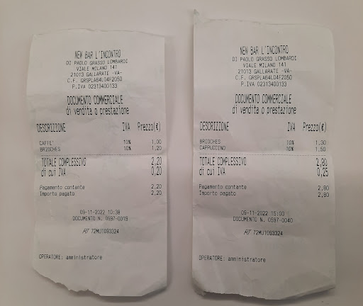 Ieri mi sono fermato in questo locale per una breve colazione, consumando un caffè e una brioches, pagando in totale € 2,20. Visto la convenienza di prezzo, torno nel pomeriggio, per fare una breve merenda, anche perchè la tabella presente al mattino con i prezzi esposti sopra il contenitore delle brioches, confermavano il prezzo pagato e la convenienza anche su altri prodotti come, ad esempio il cappuccino, che veniva venduto al prezzo di € 1,20. Per questo, nel pomeriggio ordino nuovamente una brioches e un cappuccino. E qui l'amara sorpresa. La signora che mi aveva servito mi chiede € 2,80. A quel punto, guardo sopra l'espositore delle brioches e vedo che non era più presente il listino prezzi. A quel punto, allora chiedo come mai questa differenza di prezzo dal mattino al pomeriggio della stessa giornata e la risposta ricevuta è stata, che c'era stato un adeguamento dei prezzi. Dal mattino al pomeriggio? E poi, è giustificato un aumento così repentino del 10% sulle brioches (al mattino € 1.20 cad., al pomeriggio € 1.30, del 20% sul caffè (al mattino € 1.00, al pomeriggio € 1,20 e addirittura del 25% sul cappuccino (al mattino € 1.20, al pomeriggio € 1.50)? Ovviamente l'aumento, da parte del gestore, è stato applicato su tutti i prodotti di consumo e non solo su quelli sopra indicati. Non trovo corretto sempre scaricare sui clienti ogni aumento che tutti i cittadini subiscono e non solo chi ha un'attività, soprattutto quando l'aumento è così spropositato. Allego...