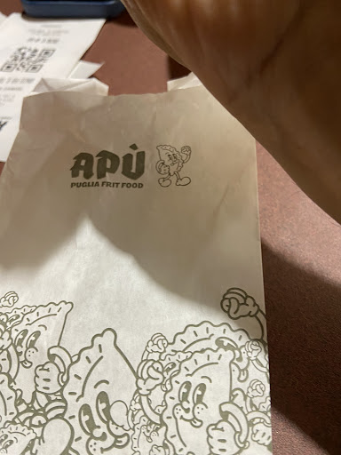Incuriosito dall’ottima campagna pubblicitaria, ho deciso di assaggiare i loro chiacchierati panzerottini. Al primo assaggio si è capito subito quanto si trattasse di un prodotto industriale. Il rapporto qualità-prezzo è aberrante, specialmente considerando che con la cifra spesa si può avere molto meglio nella stessa zona, dove sono presenti rosticcerie artigianali. Apù è il classico franchising che punta molto sull’immagine, senza considerare però che esiste fortunatamente una buona fetta di clientela che ancora riesce a distinguere un prodotto di qualità da uno scarso. Detto questo, l’unica nota positiva è stata la gentilezza e la preparazione dei ragazzi che ci lavorano, per il resto…c’è poco da commentare, i prodotti che offrono non sono buoni e non valgono quello...