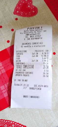 The location is very good. However this little bar that seems to be frequented by local people is instead a bit of rip off place and I explain you why: you have the feeling to be in a family run low cost bar but then you get charge 6 EUR for a glass of average prosecco and 3 EUR for a bottle of Peroni and 1.5 EUR for the "coperto" which it's applicable for a restaurant and not a bar like this one. Then I didn't understand the price of the food: 5 EUR for a whole pizza Margherita which is very good price even if it is a small size but 4.5 EUR for a ham snack? Or was the rustico? If I had known this I would have gone to a trattoria instead.. Is this the reason why it's called"picciuli" (which means soldi in Sicilian)? You won't get any more picciuli from me. Anyway I have seen worse and I am writing this review just to give a constructive criticism but I have to say that you can go to a better place for the same price in that street. The staff and the service was very good and...