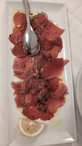 Read moreMake a reservation via WhatsApp to be sure to get a table, because this is a popular spot for locals and visitors alike. The restaurant focuses on fresh seafood catches of the day, though there are a few limited vegetarian dishes. Ask the staff for recommendations for daily fresh fish, because the menu changes accordingly. The standard menu items are ok too, fresh pastas etc. I got the red tuna carpaccio in olive oil and lemon, swordfish gratin, and mixed seafood orecchiete pasta with tomatoes. All were excellent but I wish I had gone all out for the whole fish of the day (secondi) and skipped over the pasta (primi). Anyways, the service was kind and helpful, never intrusive, and the dining room is lovely and spacious with a vaulted ceiling and windows overlooking the harbour. In the summer and daytimes of the off-season there is limited outdoor seating. If you're driving allow time to find parking on the mainland and about 15-20minutes walking over the bridge to Gallipoli Vecchio since there is very limited parking...