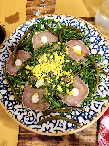 After a 24 km walking, we ended the day here, a nice and cozy trattoria, on the Sunday evening. Not too many people, but the personal seemed very stressed. We hade a package paid in advance (B&B and dinner), so we didn't have too many options. At the first, they seemed to understand what is about. We've got a place and a menu in italian (not our strong field) and we were waited for some time to get help. The waiter come and took our drink order (no aperitif, only red and white wine of the house. When it was time to order, the waiter get confused when we explained that we don't know what is in our fixed menu. Again, back to the kitchen, asked, came back with the choises and we could order some. We took gnudi (some dumplings with ricotta cheese and spinach served with ragu from a local sausage. It was the best, so compliments to the chef! Next dish was some grilled meat, served with ruccola, red cabbage strips and diced, boild carrots, beetroot. The potatoes served separate, was too salty to eat, unfortunately. It was OK, but not more. Our choise of white wine didn't match the food at all. We arrived at the place at 19:30 and after one hour we could start to eat! The stuff was friendly, but to stressed and...