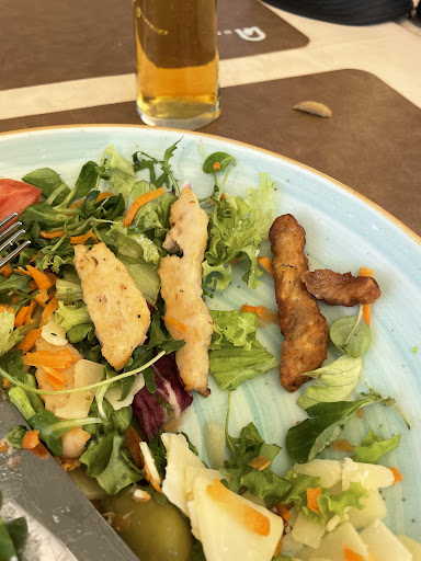 Service good, pizzas acceptable. My own experience: Chicken salad - consisted of thin slivers of pre cooked chicken then fried into chewy cougons. I grimaced and immediately waiter was very responsive, took salad away and approached manager straight away. Manager brought out a whole batch of pre fried cougons and proceeded to eat one in front of me to show me that he thought it was acceptable. I just said a couple of words (equivalent to I don’t agree). No arguments. So the food was taken away. About 10 minutes later the manager emerged with a salad topped by freshly fried chicken. Clearly the restaurant is re frying yesterday’s chicken and serving to tourists if they can get away with it. A sign that this place has low standards. See photo. Chicken comparison can be seen as some old chicken was left on my salad by mistake. I compliment the management for not charging for my chicken salad. That is a good sign but the whole episode should not...