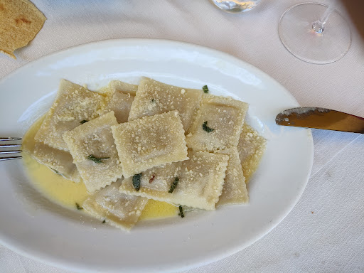 Per quanto riguarda i primi piatti ci è stato consigliato di assaggiare prima il Tagliolino al burro fuso e tartufo e successivamente l'altro. Effettivamente ottima indicazione in quanto il tagliolino al pesto era molto intenso come sapore. Entrambi perfetti, ottima cottura e ottimo condimento. La pecora al sugo con piselli mi ha fatto sentire a casa, sapori autentici e genuini. Squisita. Le favette io personalmente non le ho mangiate in quanto fabico, ma la mia compagna ha apprezzato al 100%.