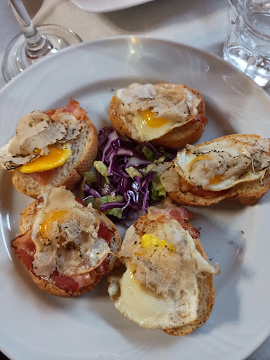 Ordiniamo una porzione di varie vivande da dividere in due. Iniziamo con degli entusiasmanti crostini al guanciale croccante, uova di quaglia e tartufo. Non da meno la fonduta assortita, classica, ai funghi e al tartufo, servita accompagnata da cubotti di pane abbrustolito. Di primo un assaggio di ravioloni e di tagliatelle al tartufo. Buoni i primi, ancora di più le seconde. Continuiamo con una gustosa frittata al tartufo “accomodata” in una cialda di parmigiano e una, un po’ deludente trippa in umido. Concludiamo il pasto con una crema catalana degna di nota.