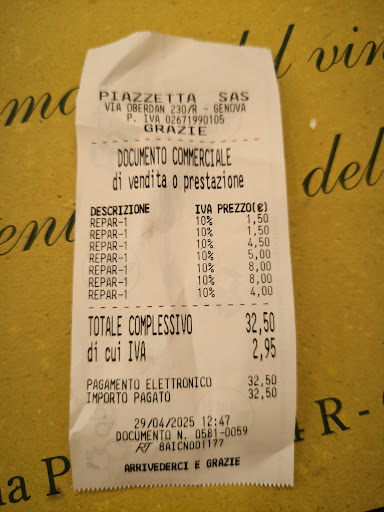 Read moreI recommend passing by this place. We ordered 1 focaccia, 1 farinata, 2 aperol and juice. After ordering, we were served nuts and chips. As a result, we spent 32.50 euros for a light meal. I think it's too expensive. For a cafe, focaccia and farinata are absolutely not tasty. I have no complaints...