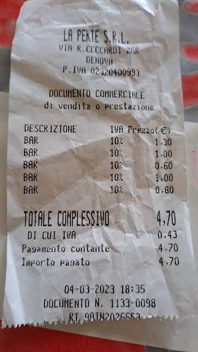 Read moreMi trovavo in centro per una passeggiata con i miei due bambini, ad un certo punto ai due "scappava", sono entrato nel bar ed i dipendenti, alla richiesta di poter usufruire dei servizi igienici, si sono subito resi disponibili ed in maniera molto gentile mi hanno indicato dove si trovavano. Inizio da questo racconto per fare capire a molti altri commercianti che la disponibilità e cortesia nei confronti del cliente, anche quello sconosciuto, sono alla base della fidelizzazione del medesimo! Comunque, anche per non approfittare della cordialità, abbiamo consumato 4 ottimi biscottini, ed io ho preso un caffè decaffeinato che per odore, sapore e cremosità sembrava a tutti gli effetti un caffè normale, ottimo! Il prezzo giusto, il locale che si estende su due livelli, molto pulito ed ordinato, servizi igienici puliti, servizio al tavolo disponibile, La cordialità del personale e l'apprezzabile fatto che erano tutti vestiti con una ordinatissima divisa è eccellente! Cliente fidelizzato e ritornerò sempre con vero piacere, ovviamente lo consiglio ai residenti ed ai turisti, visto che si trova a due passi dalla bellissima piazza Raffaele Dè Ferrari dove si trova la...