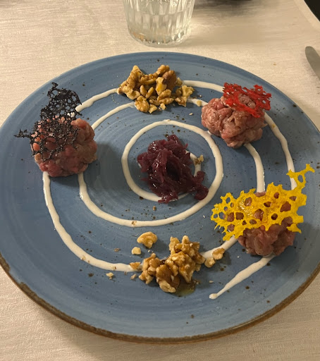 Ho iniziato con una tartare di fassona accompagnata da una delicatissima salsa allo yogurt: un equilibrio perfetto tra sapore e freschezza. Le trofie al pesto, rigorosamente fatto in casa, sono semplicemente divine — il profumo del basilico e la cremosità del condimento ti trasportano direttamente nei vicoli della Riviera.