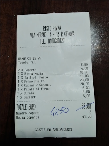 Read moreCena con mia moglie in questo ristorante sulla Via Aurelia a Sestri Ponente , in una zona non particolarmente attraente del quartiere . Prenotazione effettuata con lo sconto 50% di Thefork . Il locale è piccolo e ben tenuto e fa servizio sia di pizzeria che di ristorante . Il titolare gestisce anche un altro locale a Varazze , a cui si dedica maggiormente nella stagione turistica . Noi abbiamo preso un primo di pesce ( ottimo ed abbondante ) e degli spaghetti al pesto ( salsa troppo pallida e poco gustosa ) , per secondo una pizza bufalina ( discreta ) ed una seppia cotta nel forno a legna ( buona ) . Il servizio è stato molto cortese e la toilette in perfetto ordine . Prezzi di listino un po' cari ma con lo sconto è stato un affare . Allego il nostro scontrino...