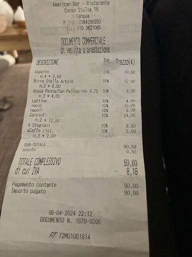 Questa la mia esperienza Conosco da anni questa pizzeria in quanto da me frequentata parecchio per vicinanza e pizze buone Questo locale ha prezzi un po più alti di altri locali /pizzeria con altri di simile location in zona però come ho detto essendo a me comoda ,ne ho usufruito anche con cene tra amici ,tavolate numerose Putroppo anticipo che nn la frequenterò più per questo motivo :eravamo in 4 : abb ordinato focaccia iniziale da dividere in 4 e 4 pizze Tra queste e n’era una margherita a cui abb chiesto di aggiungere carciofi e una Venere a cui ho chiesto di togliere zucchine per aggiungere carciofi Come si vede da scontrino hanno considerato le due pizze come pizza “carciofi” che tra l altro nn esiste in menù Quindi il proprietario da cui mi sono recata giorni dopo per chiedere chiarimenti (Putroppo nn mi sono accorta subito al momento di pagare di questo errore)ha sostenuto che lo sbaglio è stato dei camerieri in quanto quando arriva la comanda :con carciofi in automatico 😳si intenda pizza con i carciofi il cui costo è di 12 euro Cioè questo E’un prezzo stabilito Peccato che nn esista la possibilità di vedere scritto da nessuna parte. Il costo di una pizza carciofi è cosa più importante queste NN ERANO PIZZE AI CARCIOFI ma semplicemente una margherita con un quarto di carciofo sottile sopra e una venere con al posto delle zucchine (quelle che hanno tolto nn contano ?)tre di num pezzettini carciofi Allora tralasciando il fatto che una bottiglia da 0,75 di acqua San Pellegrino a 4 euro mi sembra veramente eccessivo (nonostante il proprietario ne vanti la qualità e mi ha avvisato che la aumenterà !!attenzione!!) il coperto a 2,50 ,nn trovo assolutamente giusto e corretto il trattamento ricevuto Il proprietario mi ha parlato di un errore di comanda ecc ,di una sorta di automatismo,io penso e nn credo mi spiace alla buona fede Mi ha parlato dei costi alti ecc e della posizione della sua pizzeria Quindi mi ha offerto due caffè Probabilmente avrà sempre persone con stipendi evidentemente altissimi (perché anche le persone che nn hanno locali hanno nel loro quotidiano spese alte per vivere)in grado di pagare per 5 semplicissime pizze due bottiglie d’acqua acque una lattina di coca cola e tre...