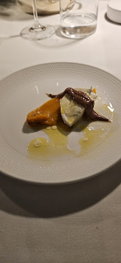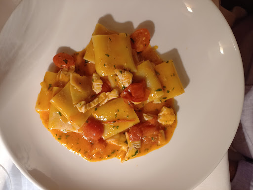 My wife and I had dinner in this elegant, refined restaurant of excellent quality located in the Foce district of Genoa near Piazzale Kennedy and has only internal tables arranged on two floors. Well set table with delicious bread and focaccia and we ordered: such as prini trenette with Genoese pesto with potatoes and green beans and as second courses a classic Milanese cutlet with its chips and stockfish salad with potatoes and new oil and finally as desserts sorbet sl linone and a hazelnut semifreddo. Everything was delicious and generous portions with the exception of the stockfish which was good but not exceptional. Very kind, friendly, competent and helpful staff while the service was attentive and very fast. The prices were logically expensive but fair and there was a misunderstanding regarding the bill. We asked them to bring the bill to the table but since it was late in arriving we went down from the register to pay and the misunderstanding was...